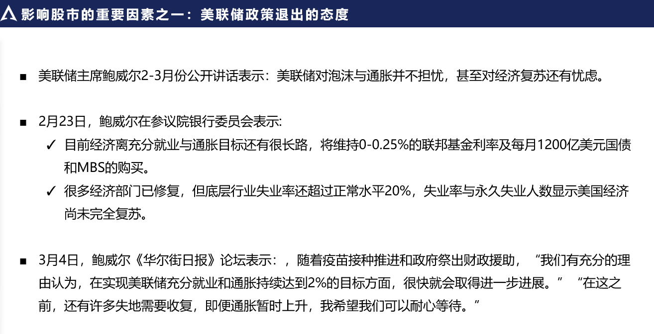 来看美联储的态度,可以得到一个基本的结论,就是他们并不着急马上收回流动性,鲍威尔在2月份3月份发表了不同的公开讲话,他们的基本的观点是什么?