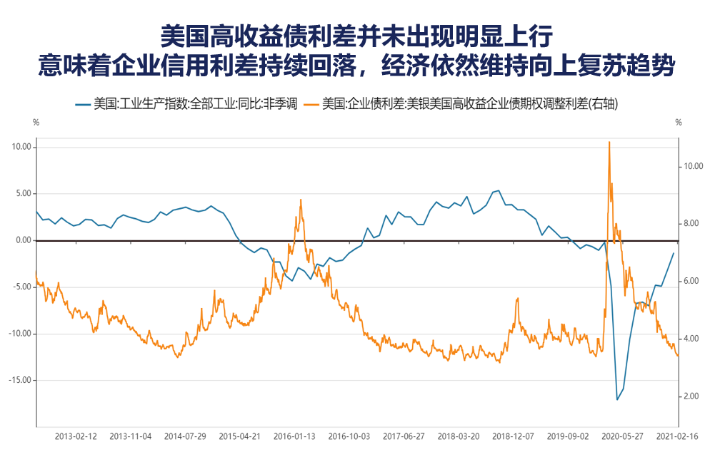 股市有很多的散户,尤其是最近像GME这些股票,里面有很多不理性的散户。但是债券市场是更加理性的,债券市场更加关注公司的基本面,因为基本面直接代表了这个公司是不是违约的,所以从债券市场的信号来说,并没有担心美国这些企业信用风险的恶化。