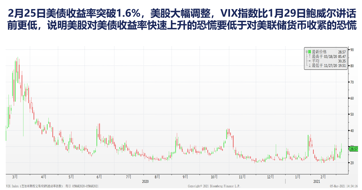每当风险爆发的时候,风险指数暴涨。2月25号美债收益率超过1.6,美股大幅的调整,但VIX并没有涨很多,说明什么?