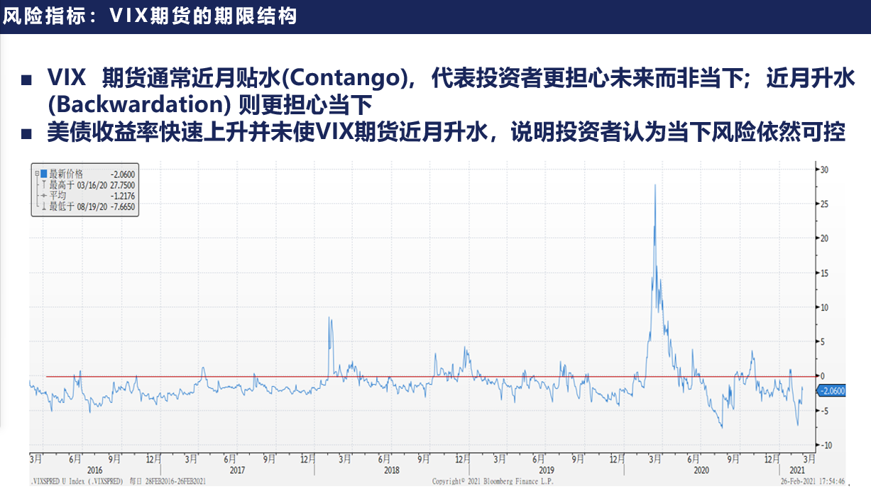 另一个风险指标VIX期货稍微有点复杂,它有一个期限结构。期限结构就是说如果短期是升水,这个指数如果是正的,说明大家非常担心眼前的风险,反正不担心未来的风险。