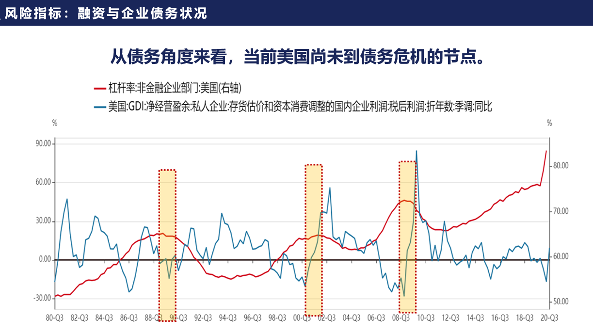 红线代表美国非金融企业的杠杆率,因为疫情他们借了很多钱,提高了杠杆,但是跟前面几个经济周期的来比较,发现前面几年蓝线 GDI其实可以达到很高的点,说明经济在往上走,到了很高点之后,美国的非金融部门的杠杆率才开始下降。