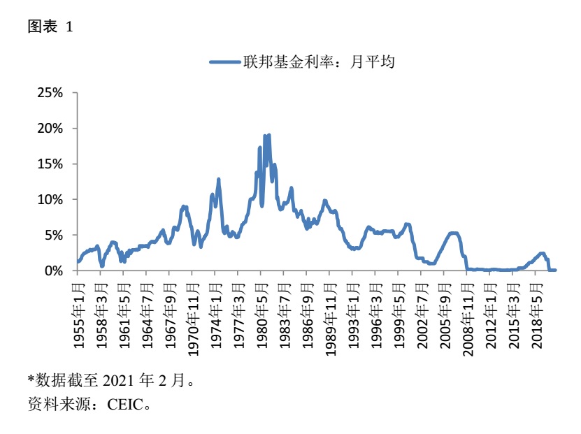 从图表 1可以看出,联邦基金利率目前处于近乎0的水平。实际上,在2008年美国金融危机发生后的很长一段时间内,联邦基金利率就停留在近乎0的水平上了。中间只是因为经济复苏短暂地加过几次息,但随着经济趋冷和新冠疫情的扩大,美联储很快再次将联邦基金利率压了下来。对美联储来说,零利率意味着传统的货币政策已基本用尽,但经济乏力迫使美联储开发了一系列的新工具,其中最重要的就是量化宽松。量化宽松就是美联储创造大量基础货币直接去市场中购买各类资产以压低这些资产的收益率,进而降低经济中的融资成本,推动经济复苏,其带来的直接后果就是美联储资产负债表的扩大。图表 2就是美联储的总资产数量,在2008年初的时候这个指标还不到9000亿美元,最新的数字已接近7.7万亿美元了,尤其是2019年开始,其几乎是直线上升。