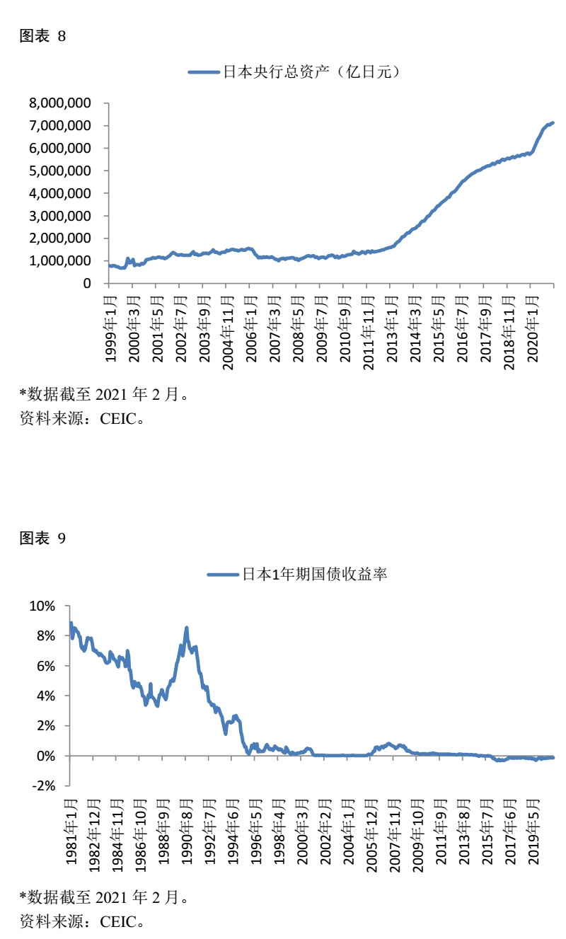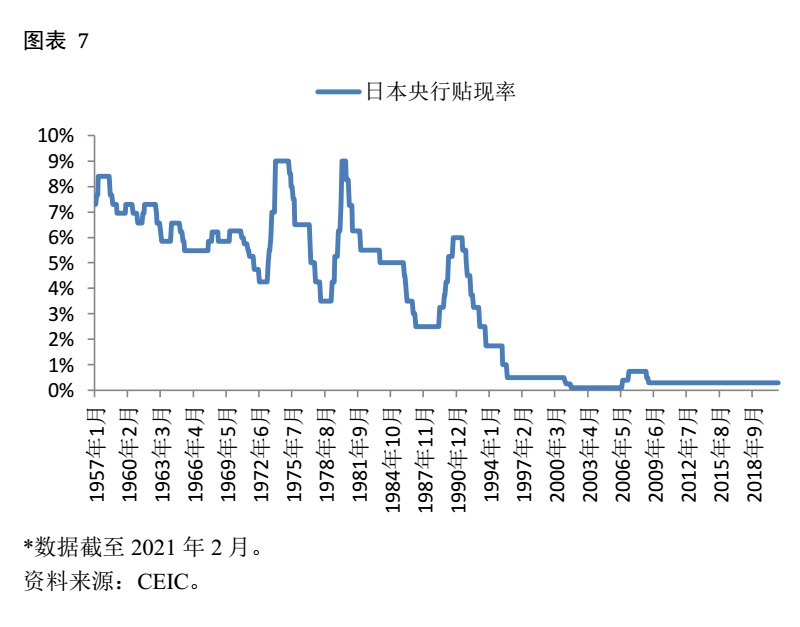 图表 7、图表 8和图表 9显示得很清楚,日本的做法与美欧也大同小异,只不过日本做得更早。早在20世纪90年代,日本就开始大幅降息,这是因为当时日本的泡沫经济破裂,经济滑入了通缩的深渊所致。