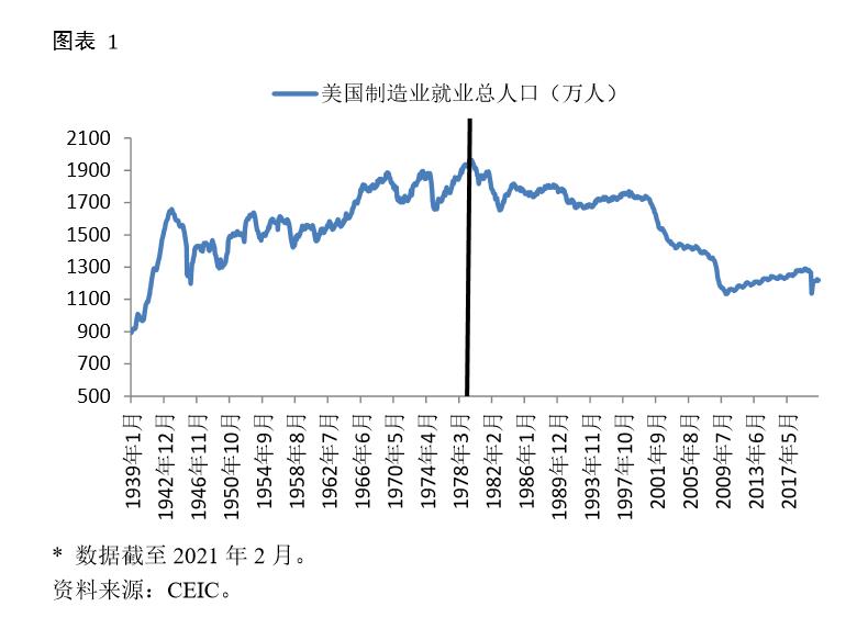 图表 1显示的很清楚,自1970年代布雷顿森林体系崩溃之后,金融全球化加速,美元的国际货币地位不但没有失去,反而由于中国等亚洲国家的加入而愈发坚固。与此同时,美国制造业领域的就业人数不断下滑,今年2月的数字已经只有最高峰(1979年6月)时的62%了。两者如此密切的联系在一起,恐怕不能用巧合来解释。
