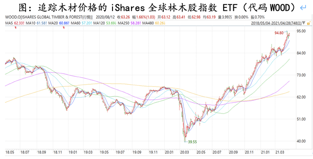分开来看,推升美国CPI物价上行的,是货币宽松周期下,美国旺盛的房屋销售以及出行需求。4月份,美国富国银行住房市场指数收于84,持续维持在高位。美国3月房屋开工率飙升19.4%,经季节调整后折合成年率为173.9万套,为2006年6月以来的最高水平。房屋销售的火爆同样带来美国木材价格创历史性的上涨,追踪木材价格的WOOD基金上涨了近19%之后,今年以来又上涨了18%。