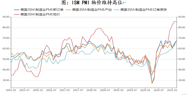 从高频数据观察,美国经济依然处于过热阶段。4月份,美国Markit制造业PMI为60.60%,服务业PMI为63.10%,自去年6月以来持续上涨。