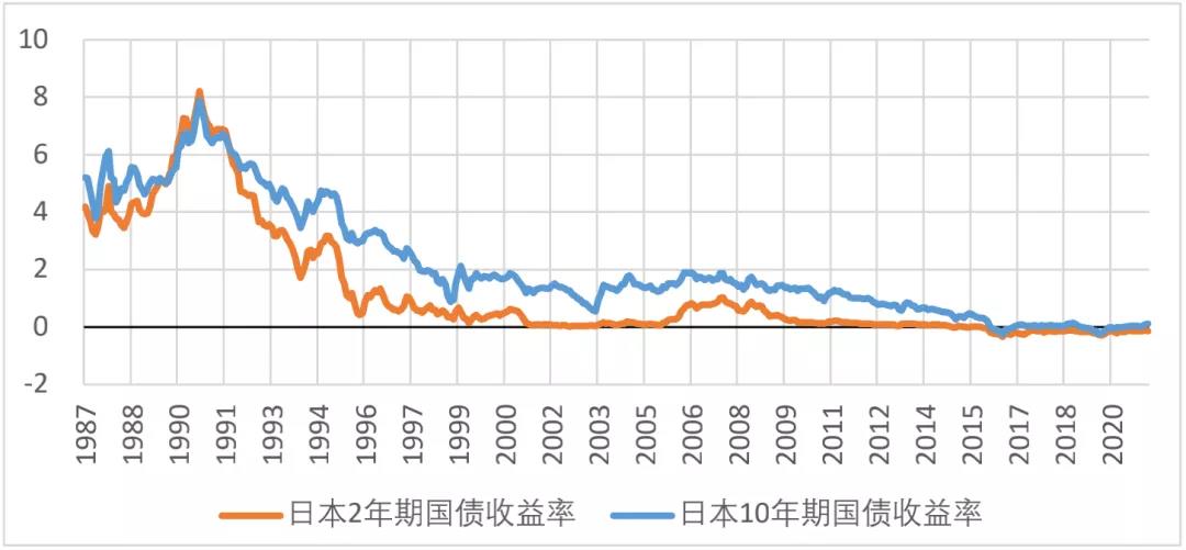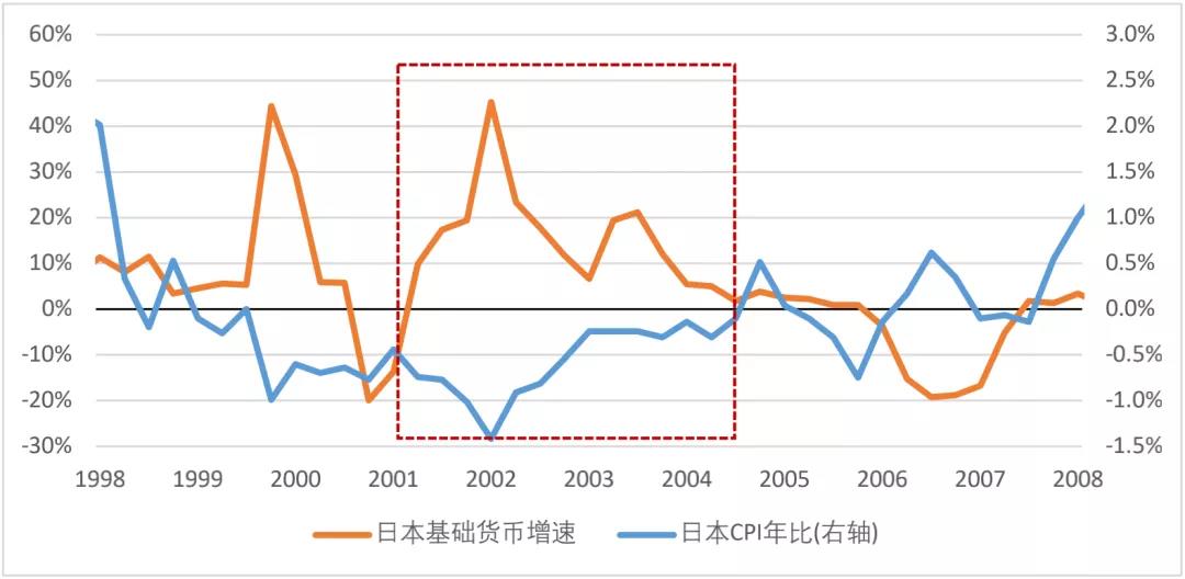 1990年日本股市和地产泡沫破裂,1999年经济陷入通缩,2001年3月份日央行首创“量化宽松”(Quantitative easing, QE),即直接购买日本长期国债,购买目标从4.8万亿日元/年一路提高至14.4万亿/年,带动日本基础货币增速一度升至45%。然而日本通胀却持续停留在负值区间,完全没有起色(图1)。这是为什么呢?