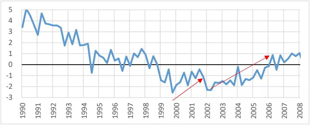 日本央行在泡沫破裂初期出手并不及时,直到1995年才将利率降至0.5%,2001年经济已陷入通缩才祭出QE。而货币政策应对通缩的效力天然不足。通缩时期,经济中性利率(即令经济达到均衡、不冷也不热的利率)往往跌入负值区间,此时即使央行实行零利率,仍然高于中性利率,因而是紧缩性的。既使叠加QE,央行也很难将名义利率压至负值(图2)。此时唯一可行的方法是“直升机撒钱”,即财政与货币政策协同,政府直接印钱发给企业和金融机构,才能帮助它们快速修复资产负债表,令经济走向新生。而日本财政部对于财政扩张犹豫不决,扩张幅度小、且倾向于过早紧缩,即便扩张也很快重回紧缩路线(图3),导致增长和通胀长期低位徘徊。