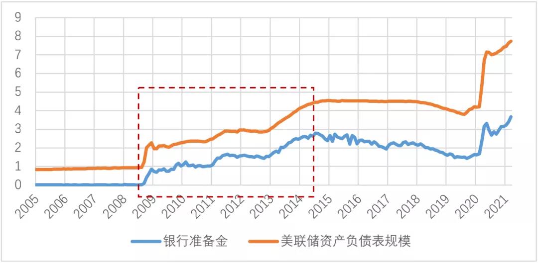 2008年金融危机后,美国迅速将利率降至零并进行三轮QE,美联储资产负债表由2008年的9000多亿美元扩张5倍至2014年的4.5万亿美元,但美国通胀仍萎靡不振(图4),只是没有陷入通缩而已。与当年的日本非常类似,美国通胀低迷同样可以归结为两点:金融危机引发资产负债表衰退,和政策扶持不够。2008年美国房价暴跌,居民资产负债表严重受损,陷入长达十年的去杠杆(图5)。金融机构亦遭重创,虽在美国政府救助下补充了资本金,但也被迫接受严格监管,扩表意愿不足。美联储QE虽带来天量流动性,但银行普遍将它们趴在帐上成为“超额准备金”,并未投入放贷(图6)。换句话说,货币宽松资金并未进入实体经济。而财政政策在2009-2010年扩张之后,在2011年即行退出,继而在2013年造成“财政悬崖”。居民部门失去援助,只好靠自身力量慢慢消化高杠杆,后继复苏进程极为缓慢,且增速一直未能恢复至危机前水平,通胀便也无从谈起。