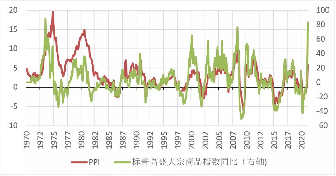 图7:美国PPI同比与标普高盛大宗商品价格指数同比(%)