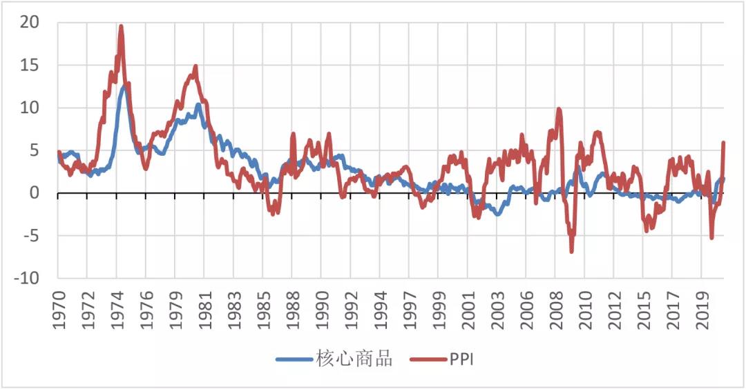 如果大宗商品本身的通胀天然具有短期性,那它们会不会通过成本渠道传导到更广泛的终端消费品,导致通胀上升螺旋呢?这里我们引入核心通胀概念,即除去食品和能源外的通胀,又可分为核心商品(goods)和核心服务(services)两部分,前者包括汽车、家具、服装等,后者则包括房租、医疗、教育等。发达经济体通胀的主体是后者,以美国为例,核心服务占到整个核心通胀的3/4。而大宗商品向核心服务传导几乎可忽略不计,仅可通过成本渠道向核心商品传导,且渠道也并不通畅。现代经济供应链高效配置,能源和原材料成本只占最终产品成本的一小部分,中下游企业会通过各种方式缓冲上游成本的波动,从而平滑终端产品物价。因此,尽管大宗商品价格与生产者价格指数(PPI)的变动高度相关(图7),但自1990年代以来,PPI与CPI的相关性已显著降低,无论PPI如何波动,CPI都云淡风轻(图8)。哪怕是2002-2008年商品长牛时代,核心商品物价仍然持续徘徊在零附近。
