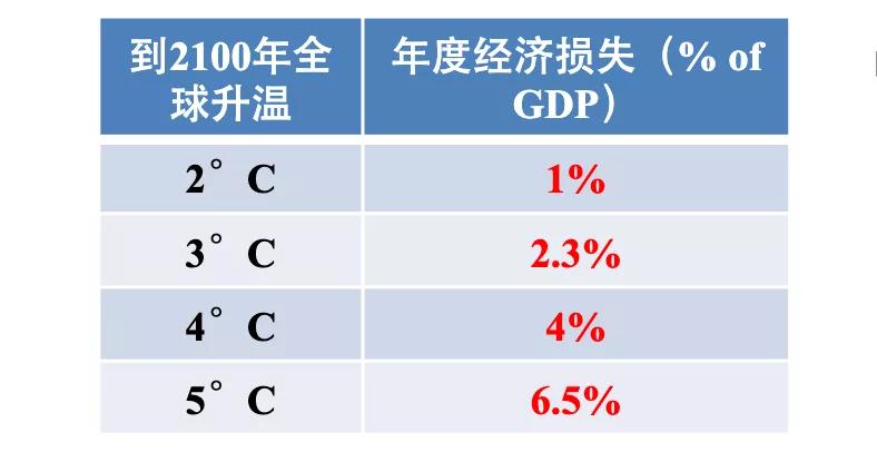 据耶鲁大学教授、气候经济学家William D. Nordhaus的测算,如果按本世纪末的全球升温为3°C、4°C和5°C的情境测算,届时对应的全球年度经济损失分别为GDP的2.3%、4%和6.5%;