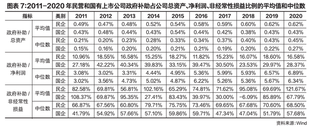 在图表7中,我们先计算每个上市公司的政府补助占总资产、净利润和非经常性损益的比例,再分为民企和国企两组计算比例的平均值和中位数。