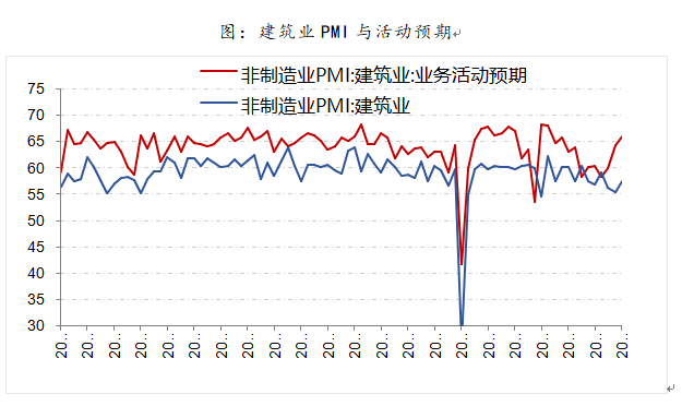 我们认为,5.5%经济增长目标比较积极(2021年三季度GDP增速4.9%,四季度经济增速4%),在出口可能下滑、地产政策约束、消费由于疫情管控短期仍偏弱背景下,加大基建投资对冲地产投资及居民消费支出下降,成为政府“稳经济”重要手段。虽然今年一般预算赤字率调降至2.8%,但政府通过综合调用一般预算账户结转结余约1.2万亿元、特定国有金融机构和专营机构利润上缴1.65万亿元,今年广义财政支出增速有望达12.8%,叠加去年已发未用专项债约1.0万亿元,今年财政扩张可能超预期。目前从建筑业PMI来看,业务活动预期很强,2月建筑业PMI为57.6,前值55.4,建筑业业务活动预期为66,前值64.4,均有回升(下图)。