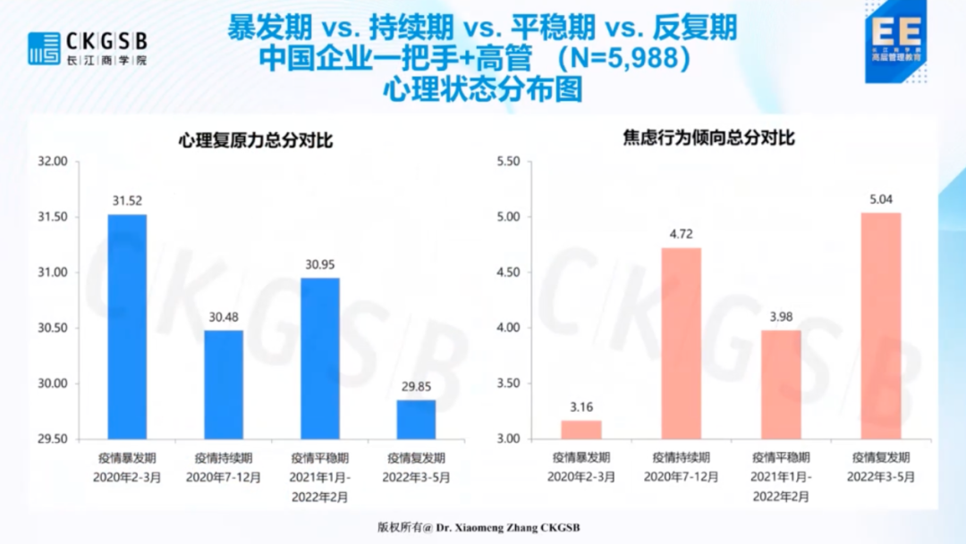 由于外界环境因素的影响,目前企业一把手和高管的心理韧性出现了明显下降,焦虑度、抑郁度也都出现了大幅上升。