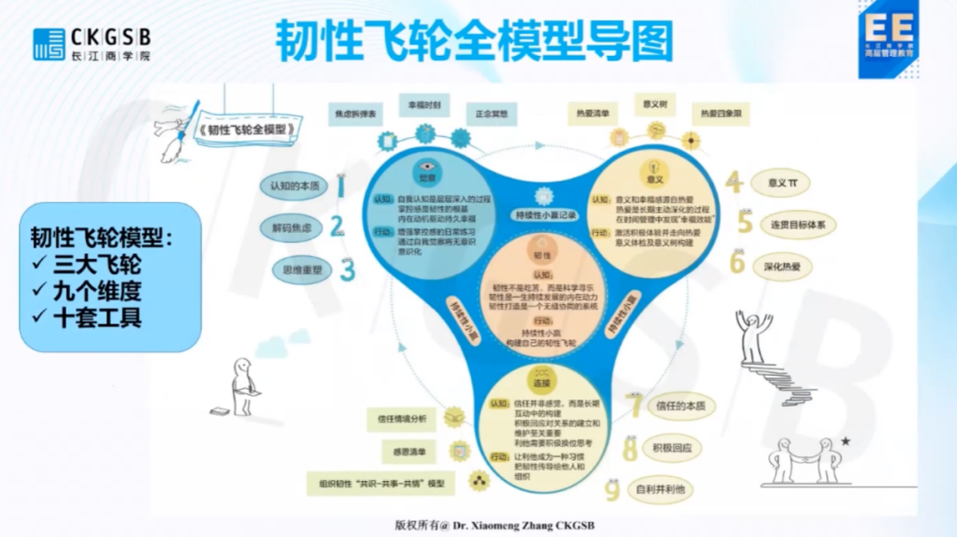 那么,我们应该如何提升心理韧性呢?以下,长江商学院副院长张晓萌分享了一个韧性飞轮模型,通过觉察、意义和连接来帮助我们提升心理韧性。