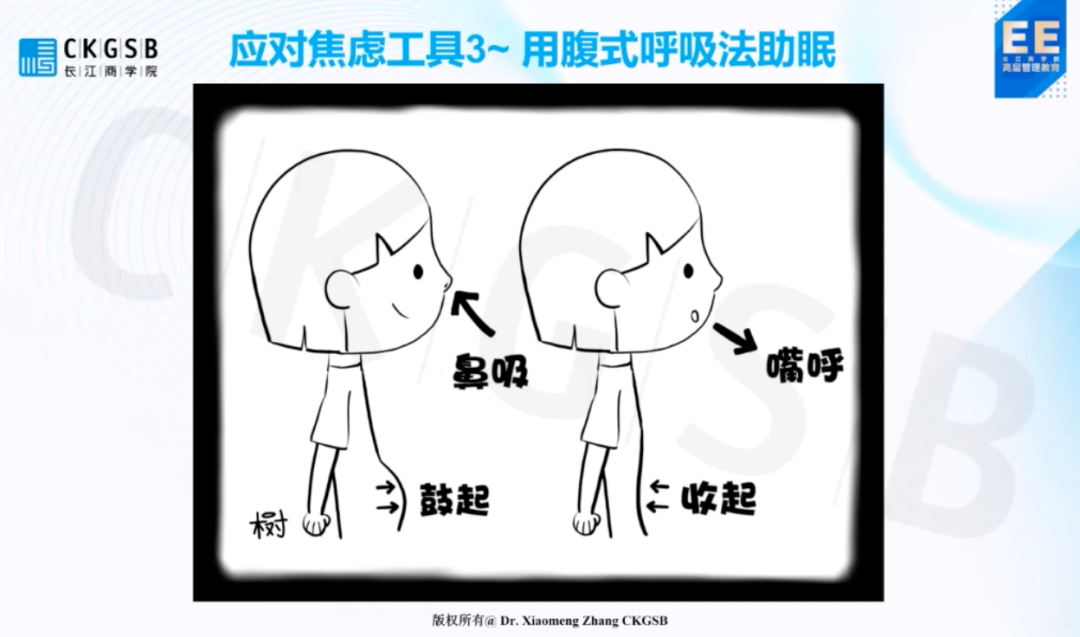 这样的呼吸方式,不仅能促进肺部往下压,横膈膜向下移动,使我们有充分的氧气充满整个肺部,更重要的是在夜晚准备入睡的时候,腹式呼吸是一个很好的锚定点,能够让我们胡思乱想的大脑瞬间安静下来。