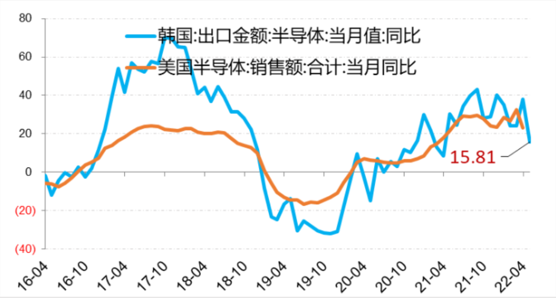 图:韩国半导体出口增速与美国半导体销售额增速