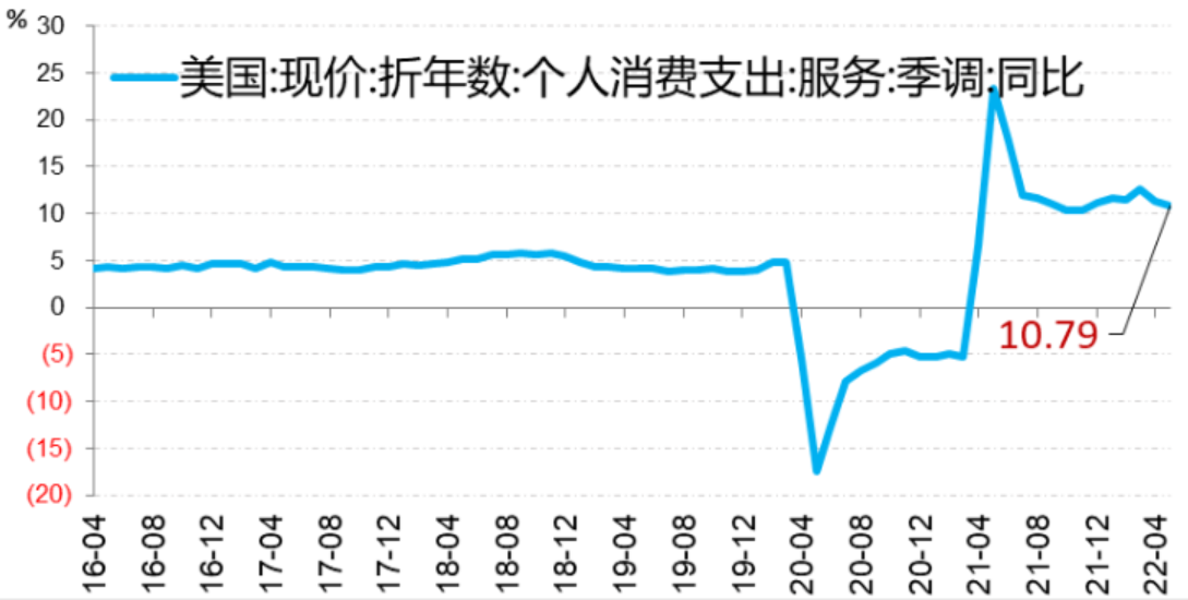 美国居民服务业消费支出同比出现回落。随着通胀高涨,美联储加息推进,以及居民储蓄率下降,4月美国居民服务消费支出同比增速10.8%,较前值11.3%回落。