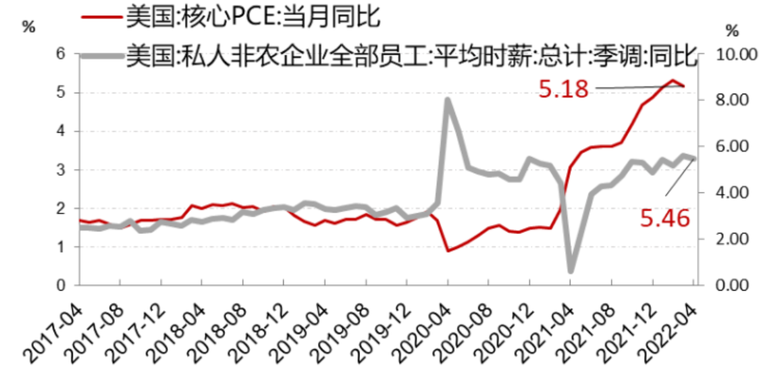 综合来讲,商品能源粮食供应端风险是存在的,但没有明显失控迹象。一方面,美国完全能够实现能源自给自足,其甚至可以启用《国防安全生产法》来加快能源生产,缓解通胀。另一方面,劳动力紧张问题会随着美联储加息、疫情好转逐渐缓解,随着收入下降,将有更多劳动力加入到市场。实际上,4月美国核心PCE同比4.9%,已经连续2个月回调(下图)。
