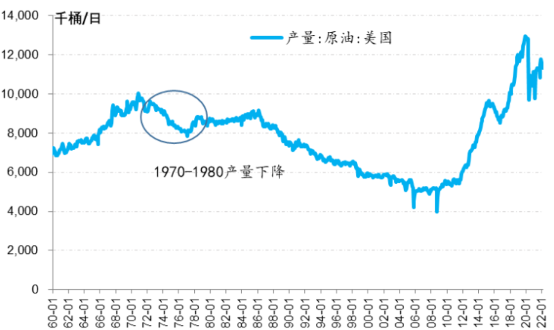 另外,凭借页岩油储备和技术,美国能够实现能源的自给自足,这跟70年代美国传统油田供应下降背景是不一样的(下图)。实际上美国在2019年特朗普时期已经实现了石油净出口,美国能源供应不存在技术与储量上难题,只是短期的人力、材料等短缺导致供应暂时偏慢。