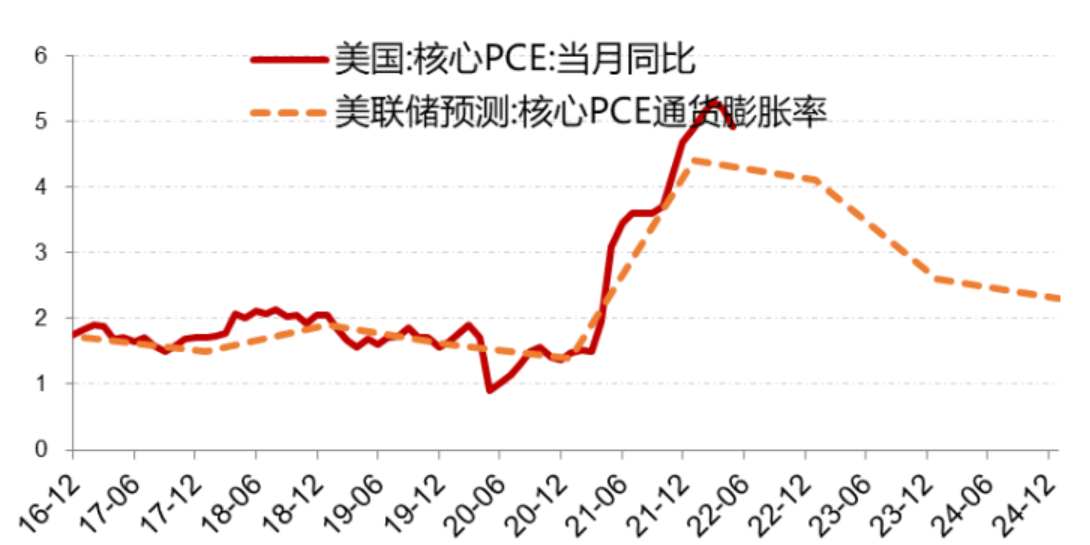 图:美国核心PCE与美联储预测核心PCE走势