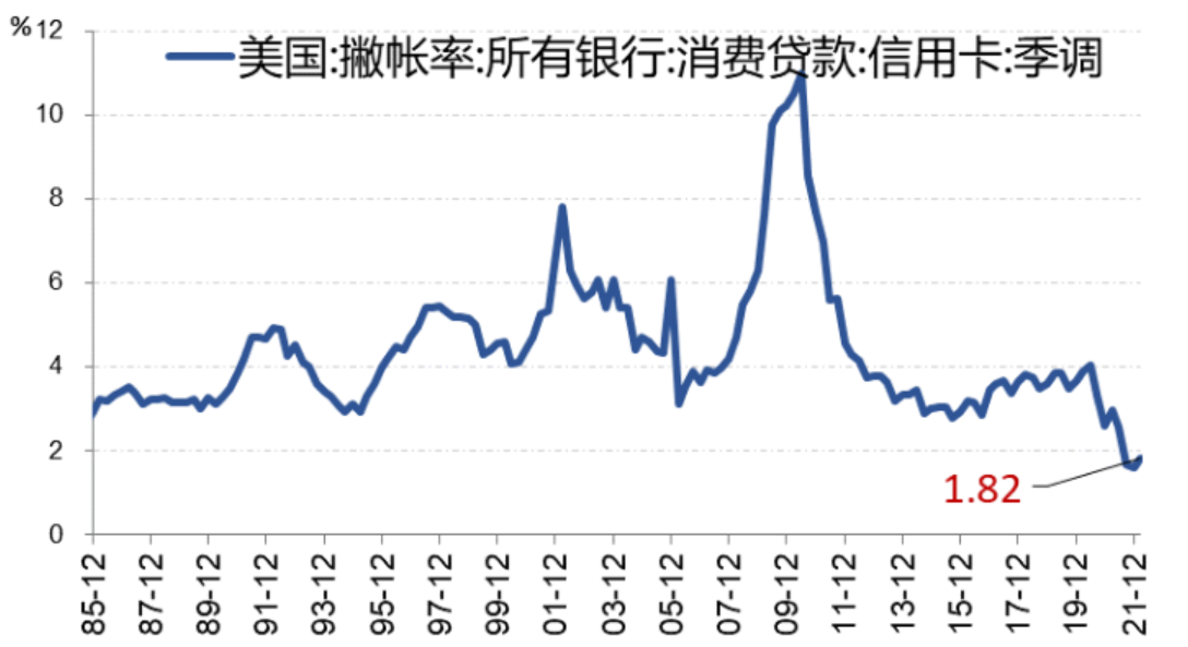 美国居民债务压力也不大。截至2021年底美国居民信用卡消费贷款撇帐率只有1.82%,处于历史低点附近,这与2000年、2008年的情形显著不一样(下图)。