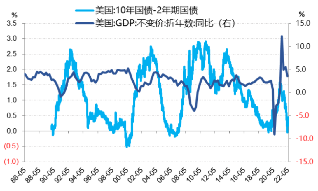 在过去周期中,美联储加息加到美债长短端利率倒挂往往预示着经济衰退。这主要由于美联储加息更多影响短端利率上升,而长端利率反应通胀与经济实际增长溢价,往往比短端利率更高。当长端利率的时间溢价出现负数(即长短端利率倒挂),意味着市场对远期经济不乐观。市场是最灵敏的,市场担忧往往最终发生,2000年、2008年就是例子(下图)。