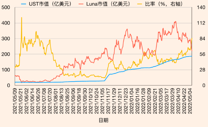 图表4:2021/05/09至2022/05/08间UST、Luna市值及两者比率