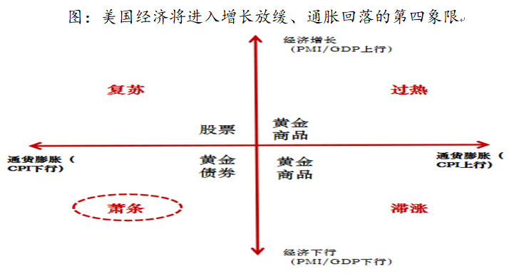 第一,美国经济增速与通胀下滑,经济将进入美林时钟第四象限——衰退。美林时钟通过经济增长与通货膨胀两个指标,将经济划分为复苏、过热、滞胀、衰退四个维度。从美国PMI及消费增速来看,美国出现经济增速下滑趋势,同时美国通货膨胀预期将从高位回落,这样美国经济将逐渐进入美林时钟划分的衰退象限(下图)。