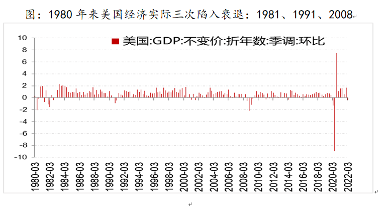 第二,相关模型显示,美国二季度GDP环比可能负增长。一般来讲,连续两个季度GDP环比负增长将被美国经济研究局(NBER)定义为经济衰退。2022年一季度美国实际GDP环比增长-0.4%(年化-1.6%),如果二季度出现负增长,那美国经济将可能被定义为进入衰退周期。7月2日摩根大通将美国第二季折合年率GDP增速预估从2.5%下调至1%,并预测美国经济“危险地接近衰退”;7月亚特兰大联储GDPNow模型显示,2022年二季度实际GDP增长(季调后的年增长率)最新估计为-1.0%,低于6月27日的0.3%。