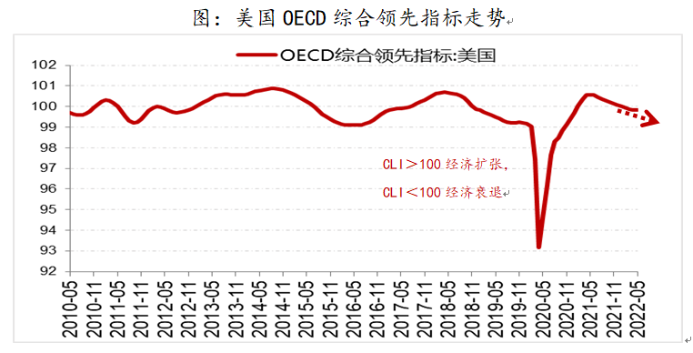第三,OECD综合领先指标(CLI)显示,美国经济已经进入谷底阶段。综合领先指标是一系列引导经济循环的相关经济指标和经济变量的加权平均数,反映一个国家宏观经济发展周期的领先指标。经过多年的实践,它被证明是一个有效的早期预警系统,能较好地预测经济体未来9个月经济活动的波峰与波谷。OECD综合领先指标将经济周期划分为4种情况:CLI<100且在增长;CLI>100且在增长;CLI>100在下降;CLI<100在下降,这四种情况分别对应经济周期4个阶段:扩张、顶峰、衰退、谷底(对应美林时钟复苏、过热、滞胀、衰退四阶段)。5月美国CLI连续跌破100下行,显示美国经济进入谷底阶段,预示美国经济存在衰退风险。