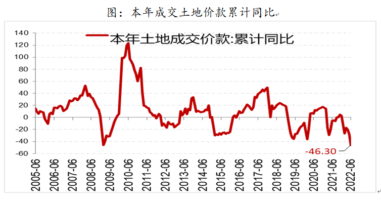 实际上,当前房企已经无力拿地,2022年1~6月土地成交较去年同期腰斩。今年前六个月100大中城市累计成交住宅用地7491万平方米,累计同比-57%;本年土地成交价款累计值2043亿元,累计同比-46%。土地成交的下行为后续房地产新开工,以及地方政府的收入开支带来下行压力。