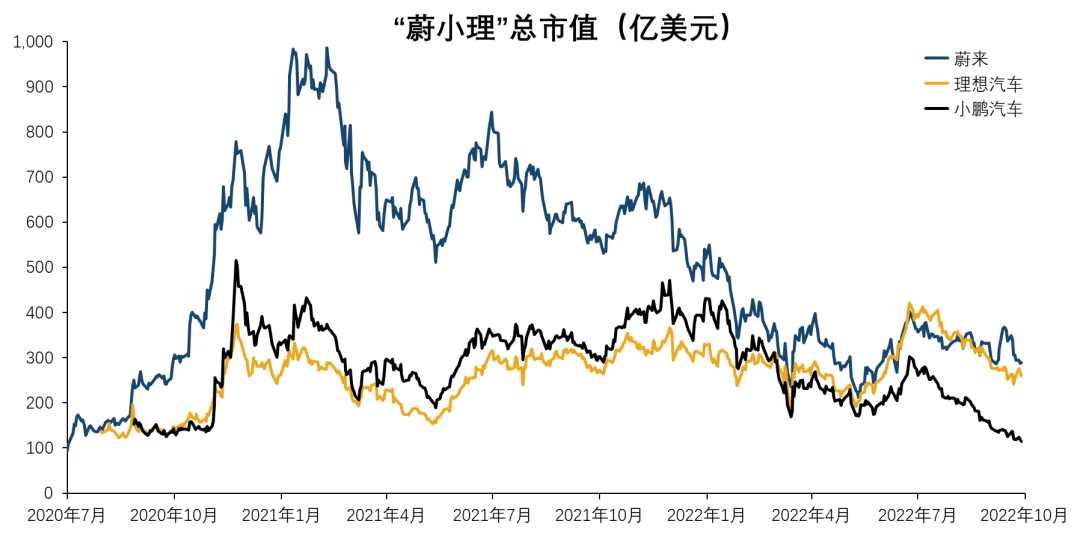 今年年初以来(至9月30日),中国造车新势力的代表蔚来、理想和小鹏的市值分别下跌51%、27%和76%;结合去年表现来看跌幅更加惊人,三家公司在2021年1月份时合计市值一度接近1700亿美元,而现在大约为600多亿美元。