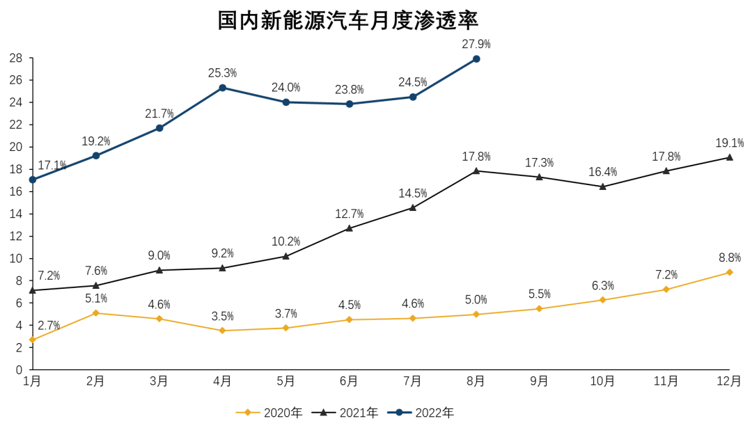 与此形成鲜明对比的是,新能源汽车市场在过去两年实际上处在一个黄金发展期,今年上半年新能源汽车销量近225万辆,相比之下2020年全年的销量才第一次突破100万辆(111万辆);据中国汽车工业协会统计,目前新车销售新能源渗透率(2022年8月)已经达到了27.9%,远高于2020年全年5.8%的水平,可以说是相对疲弱的经济大盘中的最大亮点之一。