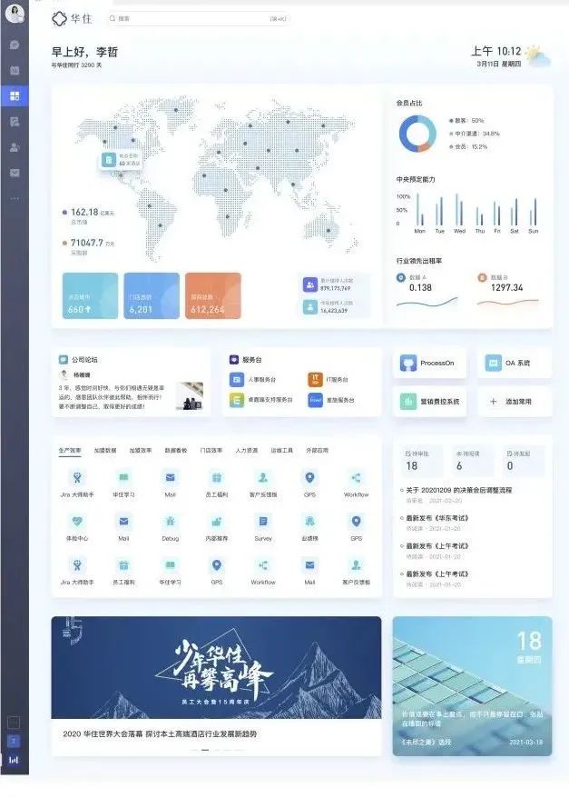 这些各式各样的系统,都以“华通”这个统一的数字化协同办公平台呈现出来。在“华通”的助力下,公司员工与客房比例维持在0.17左右的水平,明显低于同行同业。