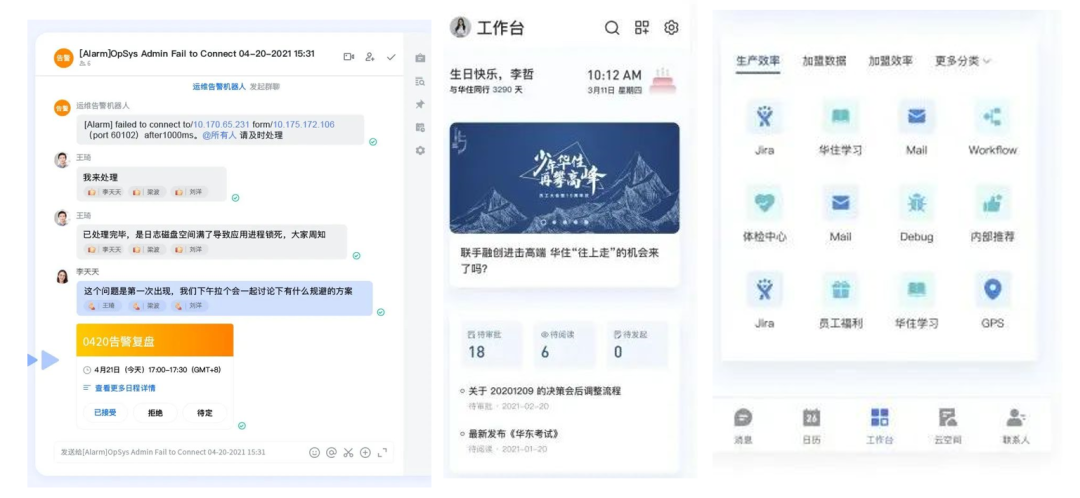 首先是基本的协同办公功能,飞书拥有主流的体验,同时飞书的技术架构较为开放,能够很好地连接华通上各个业务模块,这些业务系统所产生的任务或信息,通过飞书的通知功能,可以流畅的在人员与系统之间流转。