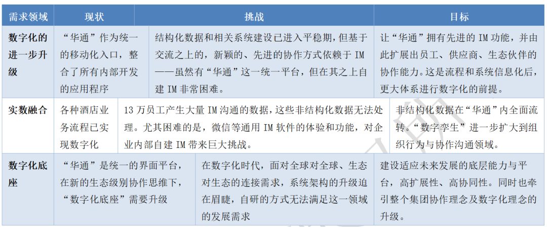 与此同时,在酒店集团,IT人员不可能像专业公司那样不断增加,并且华住的IT人员专长于对酒店业务的理解及信息化,对于通用型的平台、IM等领域的建设并不是其多年形成的能力焦点。