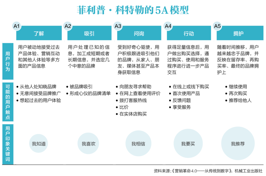 这些看似新媒体环境下的“妙手偶得”,其实符合成熟的营销理论。菲利普·科特勒在《营销革命4.0——从传统到数字》一书中,提出了数字营销时代消费者与品牌之间的触点框架,即5A模型——了解(Aware)、吸引(Appeal)、问询(Ask)、行动(Act)、拥护(Advocate)。