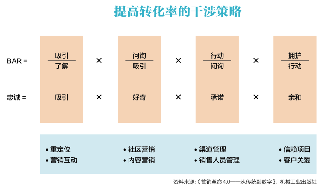 下图“提高转化率的干涉策略”进一步拆解了5A模型中各个触点的转化与行动方案。