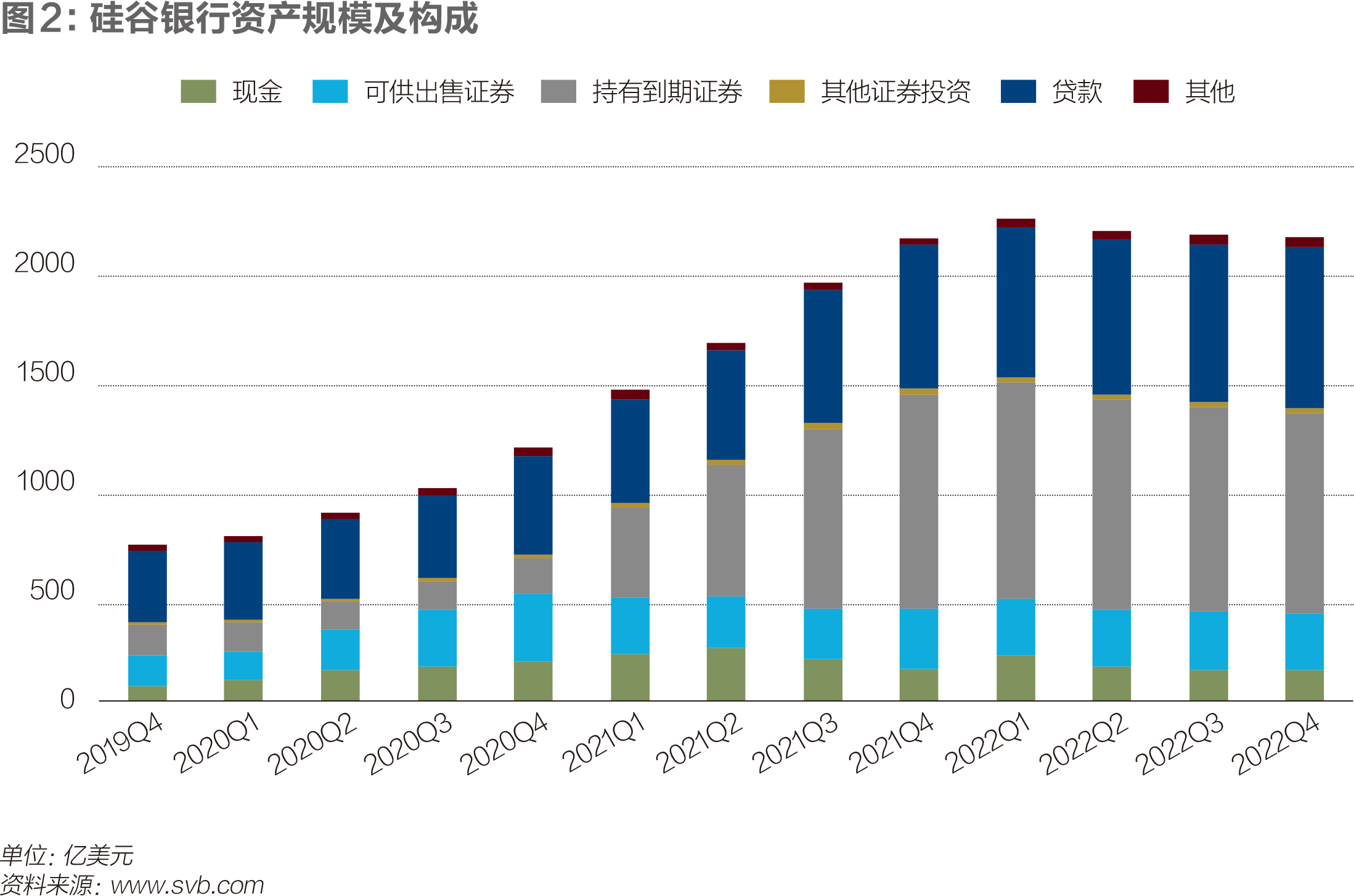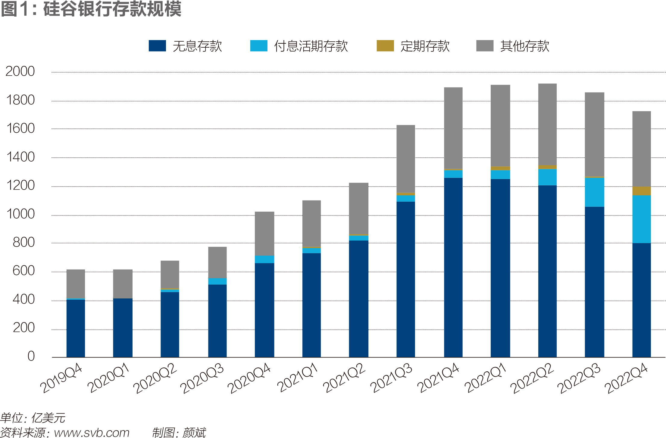 贷款和风投额度的快速增长,使科技初创企业手里积累了大量的现金和存款,而硅谷银行作为一家专注于为科技企业服务的银行,自然成为这些新增资金的一大去向。2020年二季度至2021年底的一年半期间,硅谷银行的存款规模由679亿美元上升到1892亿美元,增加了约180%(图1)。