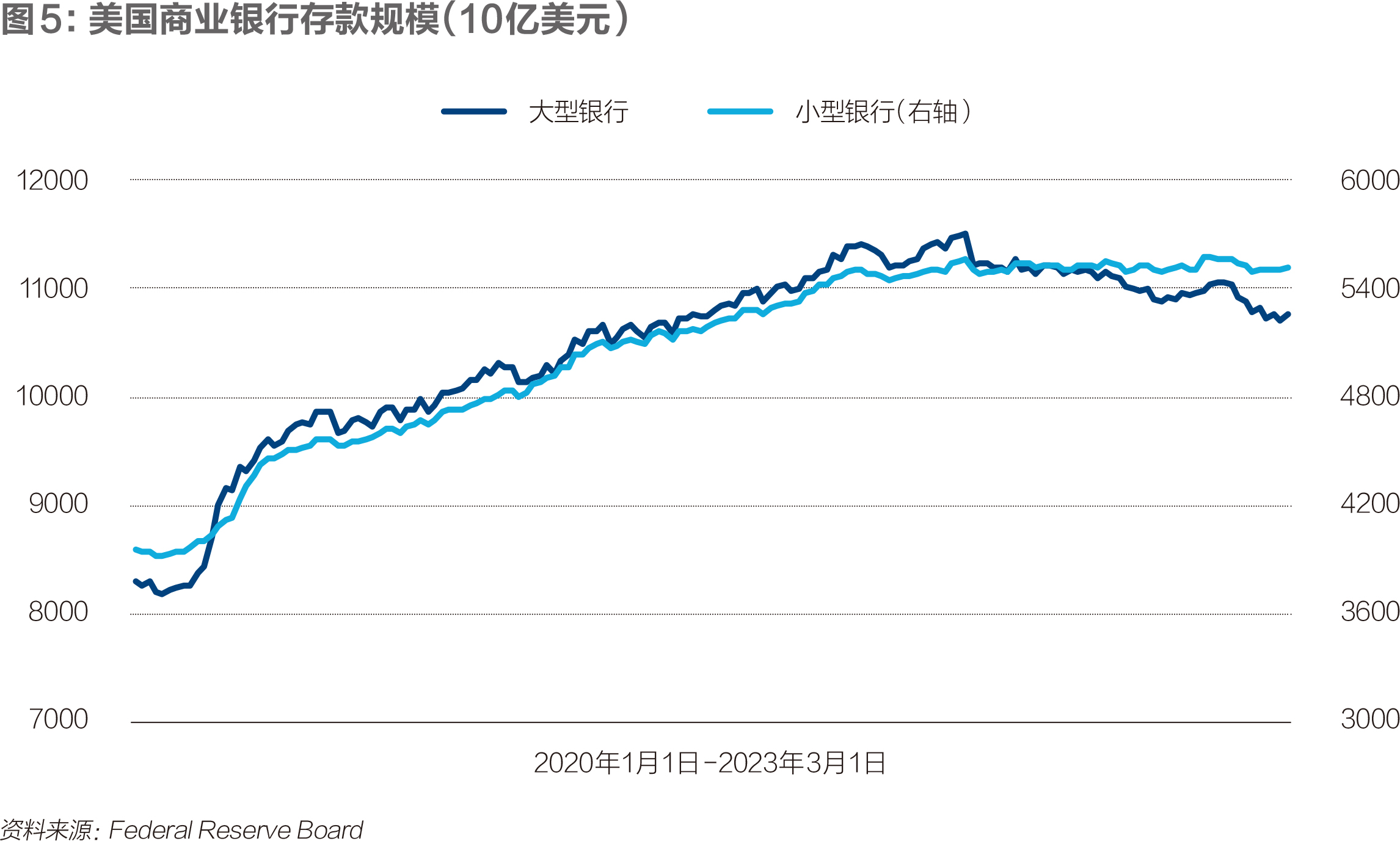 从负债端来看,存款减少主要发生在大型商业银行。自2022年3月15日至2023年3月1日,大型银行存款减少了5%,而小型银行存款则保持在相同规模(图5)。