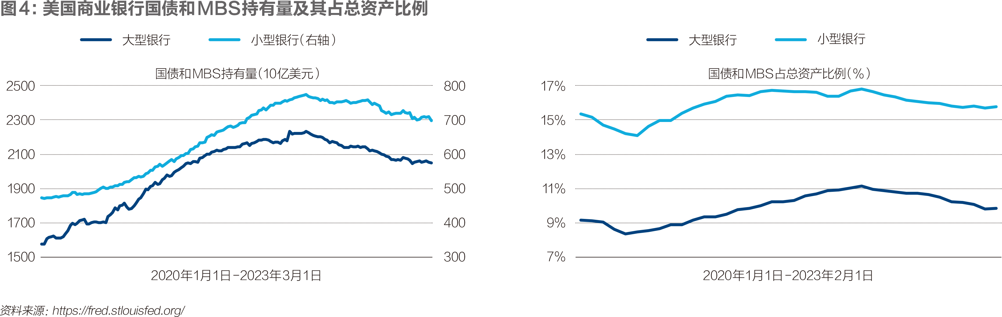 从资产端来看,自2020年以来,截至2023年3月1日,小型银行(资产规模25名以后的商业银行)持有的美国国债和MBS增长了44%,而大型银行则增长了30%。虽然小型银行的增速更快,但从美债和MBS占总资产的比例来看,小型银行的9%-11%要低于大型银行的15%-17%(图4)。