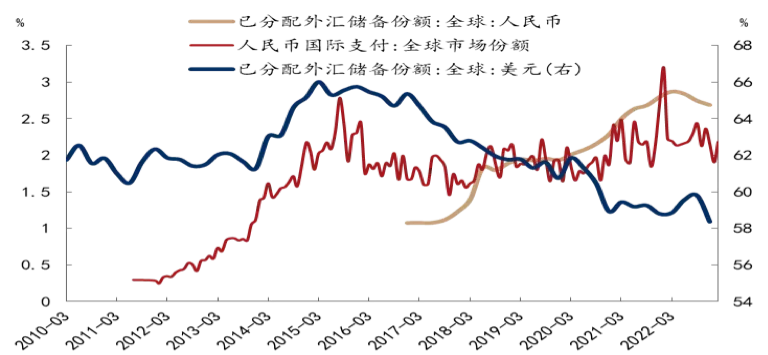 3月,巴西对外宣布与中国直接以本币进行贸易结算,取消使用美元作为中间货币。同年2月伊拉克央行宣布,允许在对华贸易中使用人民币结算。同期东盟各国财政部长和央行行长在印度尼西亚会议上讨论如何逐渐转向本币结算,减少在金融交易中对美元、欧元以及日元等货币的依赖。2023年以来人民币在国际舞台上出现的机会越来越多,一方面显示发展中国家旨在缓解美元短缺,增加外汇可及性;同时也间接显示美元霸权的衰落和对中国经济发展的信心(图1)。