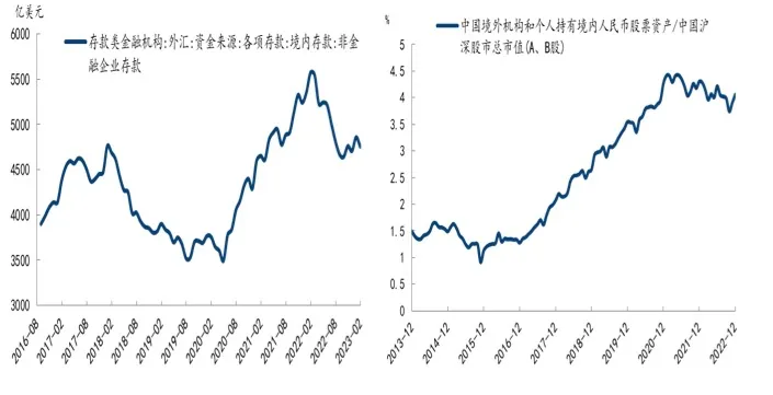 图6:中国企业美元储及境外机构及个人持有股票占AB股市值比例