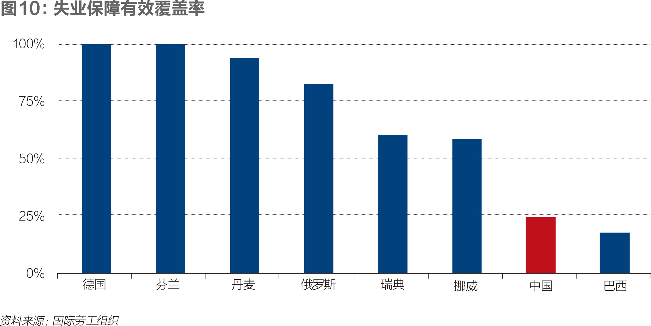 从覆盖率上来看,全球范围内失业保障都偏低,法律上仅有38.6%的劳动力受到覆盖,由于非正规就业比例高、失业保护制度的缺乏,失业人群中仅有18.6%能领取到失业保障。在本文所考察的国家中,德国、芬兰失业福利的有效覆盖率达到100%,丹麦也在90%以上,俄罗斯82.7%;中国(24.1%)、巴西(17.6%)的有效覆盖率明显不足。
