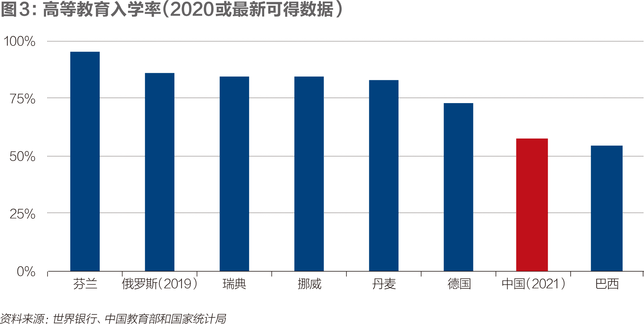 从入学率来看,所考察国家中小学教育均已普及。高等教育入学率这一指标上各个国家情况有所差异,北欧国家均超过80%,其中芬兰达到95%。德国因其教育双轨制,即高等教育与职业教育并行,大学生比例不及北欧国家,为72.9%。中国高等教育入学率为57.8%,远落后于俄罗斯(86.4%),但高于巴西(54.6%)。