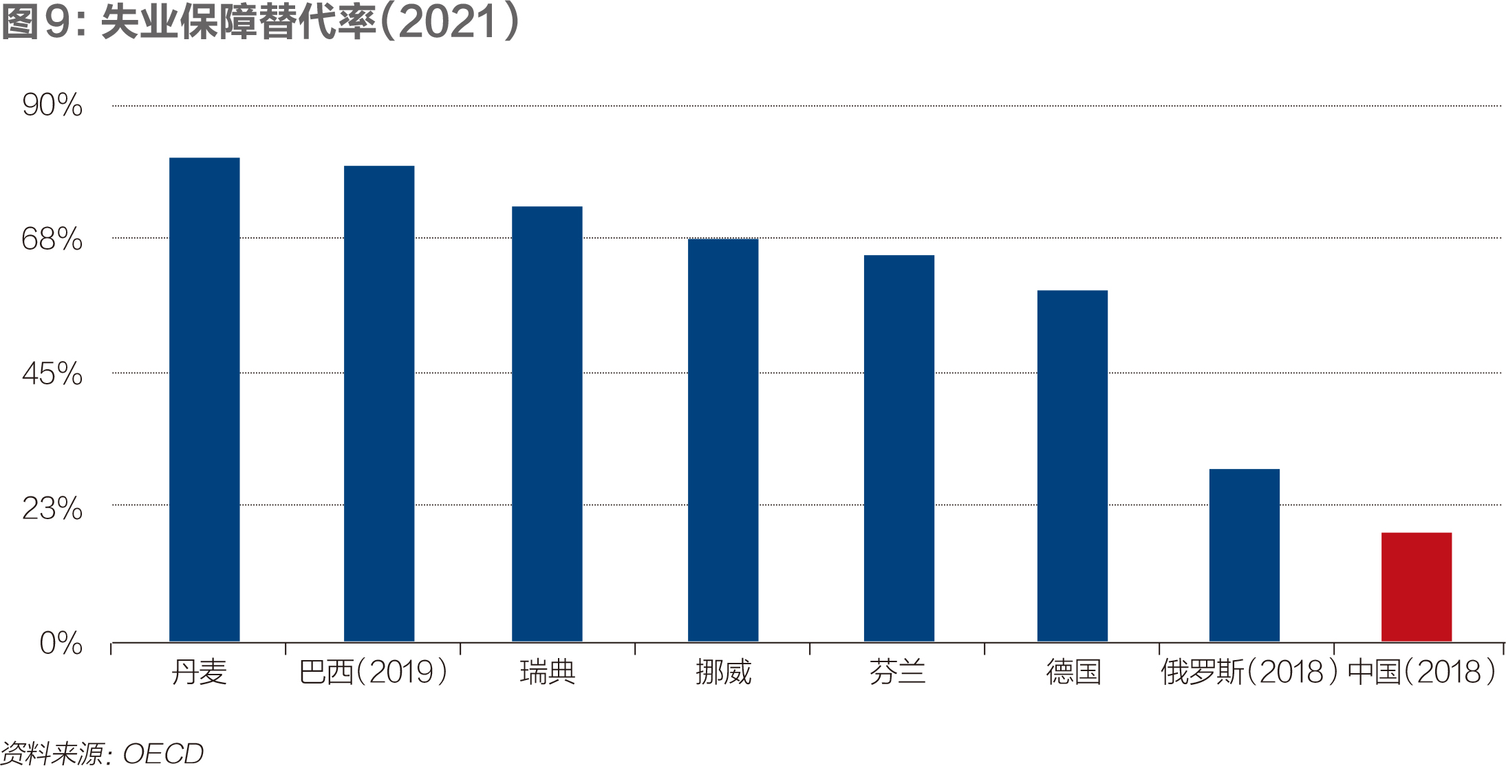 从失业后的收入替代率看,北欧国家及德国的单身中等收入者,在失业两个月后,能得到约60%以上的失业前收入。发展中国家之间显著差距,巴西失业替代率高达80%,俄罗斯失业金替代率约为29%,中国(18.4%)则明显低于俄罗斯。一般来说,过高的失业金对于再就业激励效果较弱,而过低的失业金则难以保障失业者的基本生活所需。