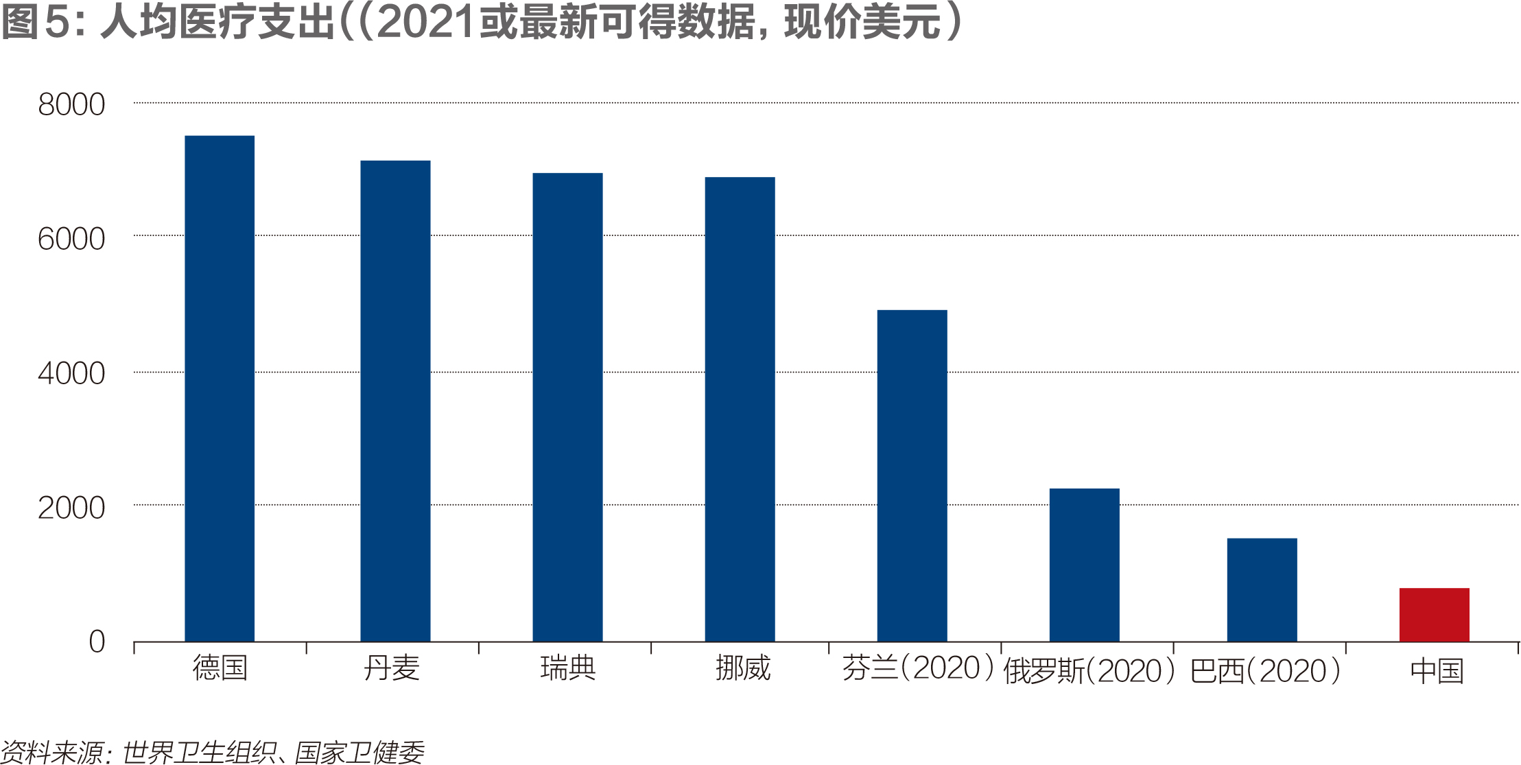 WHO用全民健康覆盖(Universal Health Coverage,UHC)指数评估一个国家在提供必要的优质基本卫生服务方面的总体进展情况。2019年,UHC有效覆盖率指数达到80以上,需要各国人均支出超过1398美元。以此为参照,根据世卫组织的统计,按照平价购买力计算,北欧国家、德国(7517美元)、俄罗斯(2278美元)、巴西(1529美元)都在这一标准之上。中国人均医疗支出(5348元,约合765美元)较低。
