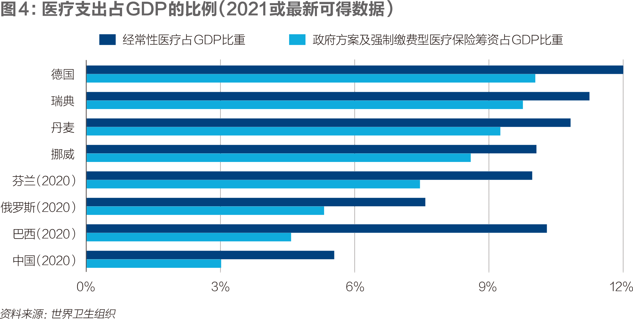 打造健全而高效的医疗体系历来是各国关注的重点,2021年US News全球医疗体系排名中,瑞典高居榜首。瑞典拥有全球顶尖的医疗水平,公民平等享受国家提供的公共医疗服务,医疗资金主要来自政府转移支付,占比约85%,体现了政府在医疗卫生方面的投入之大和高度重视。虽然实践中不乏对其效率的批评,但其分级诊疗的医疗体系维护了医疗资源的有效运转,整体上其公平与效率仍然广受业界肯定。